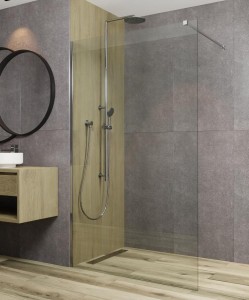 Walk-in Fuji to nowoczesna ścianka prysznicowa typu walk-in z hartowanego szkła 8 mm. Montowana do ściany na profilu aluminiowym i stabilizowana uchwytem górnym.