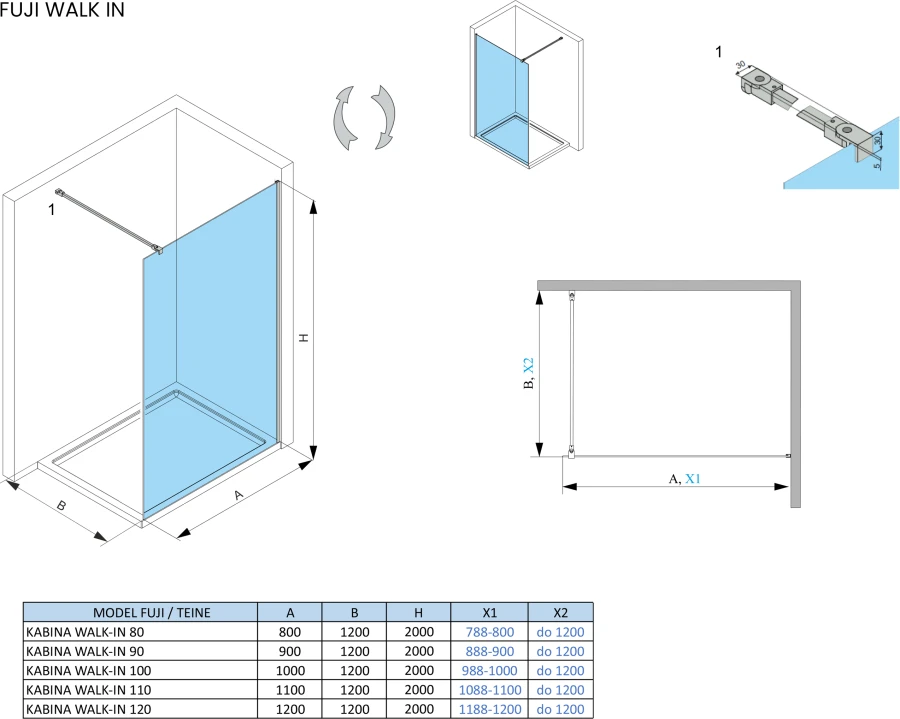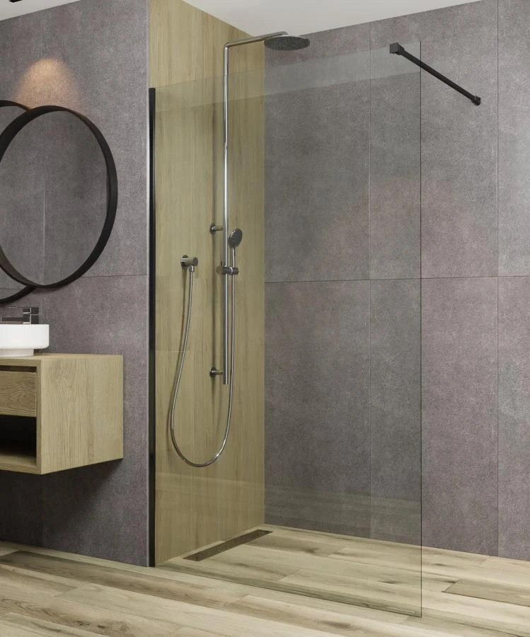 Walk-in Fuji to nowoczesna ścianka prysznicowa typu walk-in z hartowanego szkła 8 mm. Montowana do ściany na profilu aluminiowym i stabilizowana uchwytem górnym.