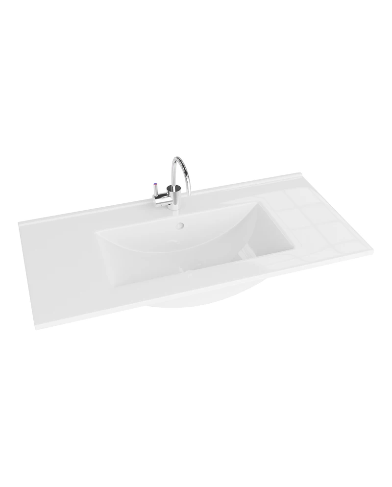 Model został zaprojektowany z myślą o estetycznej zabudowie. Po zamontowaniu na szafce pozwala zachować spójny wygląd strefy umywalkowej i ukryć elementy odpływu wewnątrz mebla. Umywalka posiada przelew oraz otwór na baterię, więc jest wygodna w montażu i codziennym użytkowaniu.