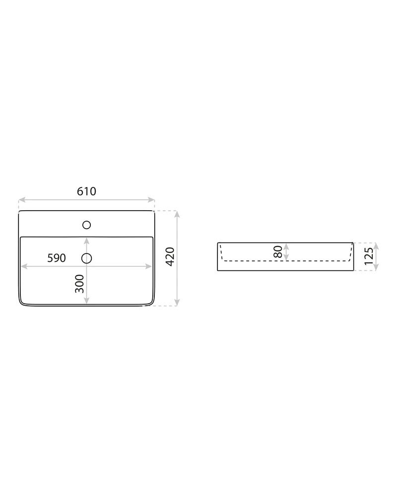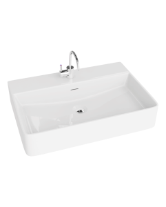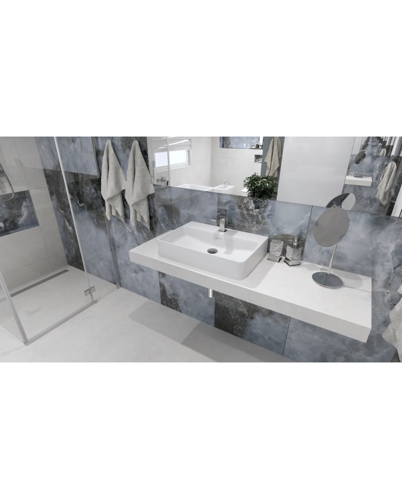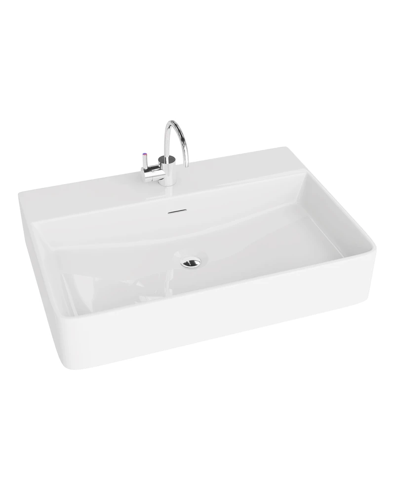 Umywalka nablatowa ALTAYA ma prostokątną bryłę z cienkim rantem i dużą powierzchnię odkładczą.