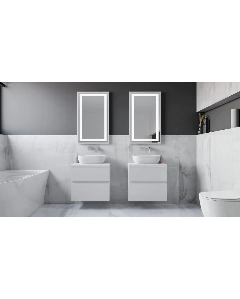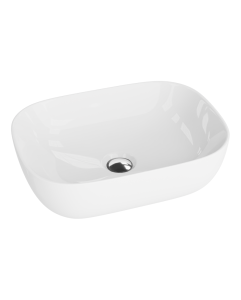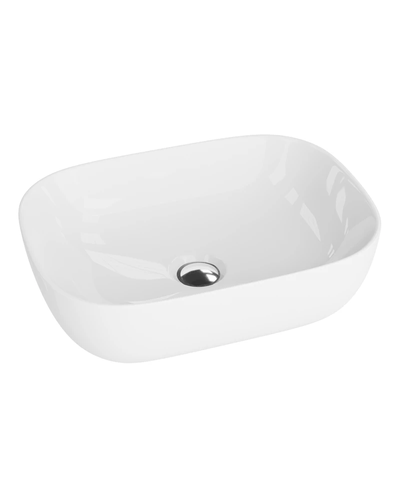 Umywalka nablatowa COSTA ma prostokątną formę z zaokrąglonymi brzegami i białe wykończenie.